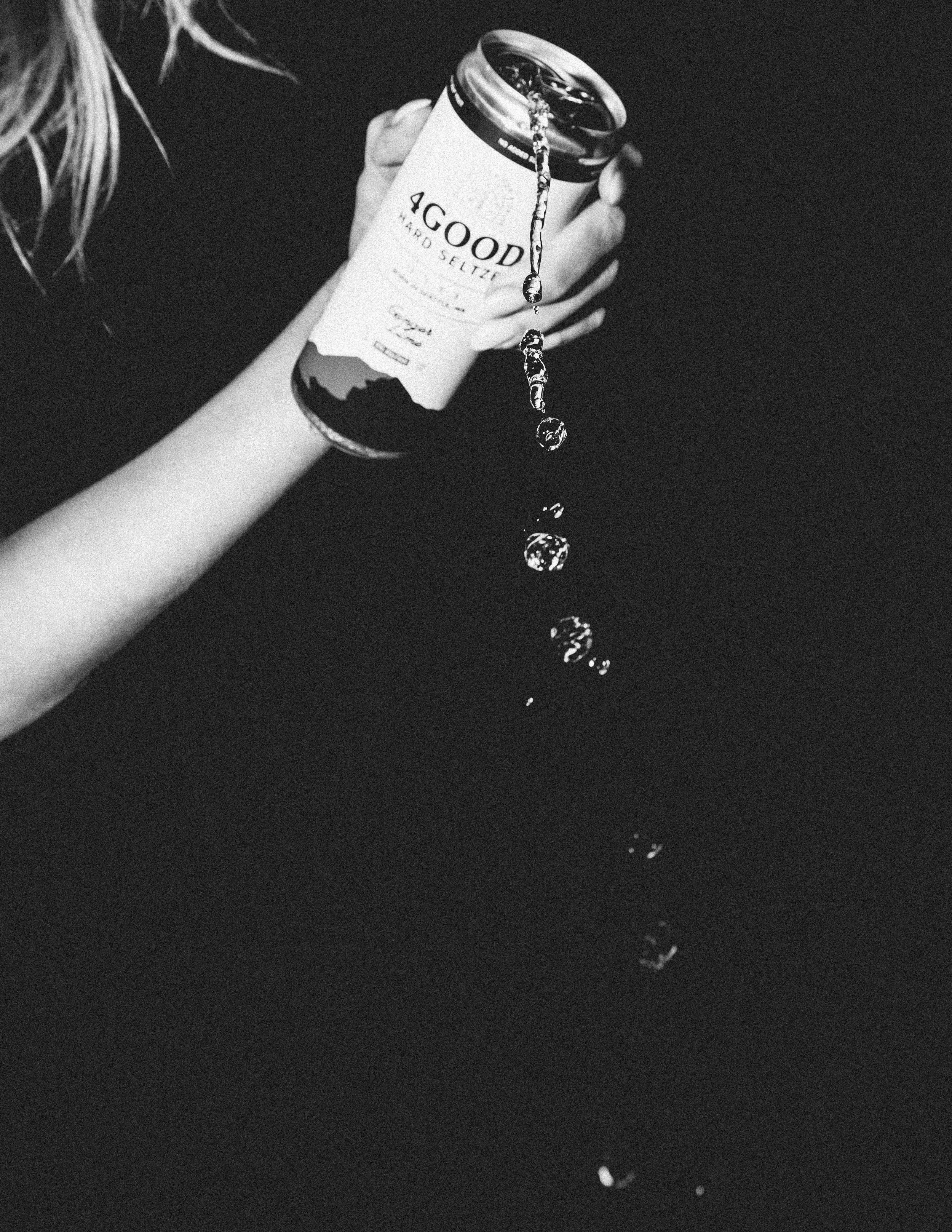 A person holding an open can of 4Good Hard Seltzer with a necklace hanging from it, and water drops falling into a dark surface.